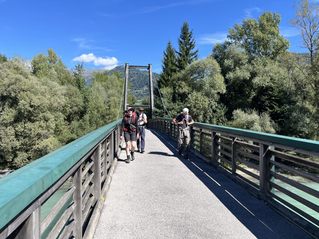 Eine Gruppe ging mit Mark direkt weiter, ich machte mit ein paar Jungs noch Mittagspause. natürlich auch bei der Hängebrücke. Auf den letzten Metern hatten auch wir eine Kuhbegegnung. Die Kühe standen einfach alle direkt vor dem Gatter. Da half nur warten. Die Jungs schickten mich vor, als die Herde sich in Begegnung setzte und ich wählte den Weg obenrum, den es offiziell natürlich so nicht gab. Kühe sind ganz schön groß. Nach dem tierischen Zwischenfall sahen Anton, Nick, Paul H., Luca, Jannik und Jonathan nur noch das Ziel vor Augen, sodass ich zwischenzeitlich immer joggen musste, um den Anschluss nicht zu verlieren. Puh! Siebzehn müsste man nochmal sein!