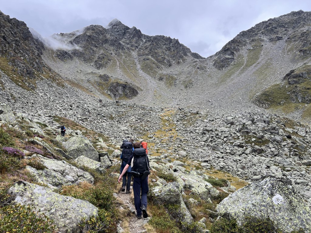 Nach einem 500 Höhenmeter hohen Aufstieg, erreichten wir den höchsten Punkt der Alpenüberquerung, welcher bei 2.930 Meter lag. An diesem Punkt konnten wir entscheiden, ob wir den Gipfel des Bösen Weibeles bezwingen oder nicht. Die Entscheidung viel aber sehr schnell: „Wir gehen da nicht hoch“. Die Wetterbedingungen waren zu unbeständig, um sicher hochzulaufen, geschweige denn sicher wieder unten anzukommen. Für ein bisschen Motivation konnten wir von oben schon die Elberfelder Hütte sehen, die auf 2.346 Höhenmeter liegt. Somit vergingen die letzten 600 Höhenmeter wie im Flug.