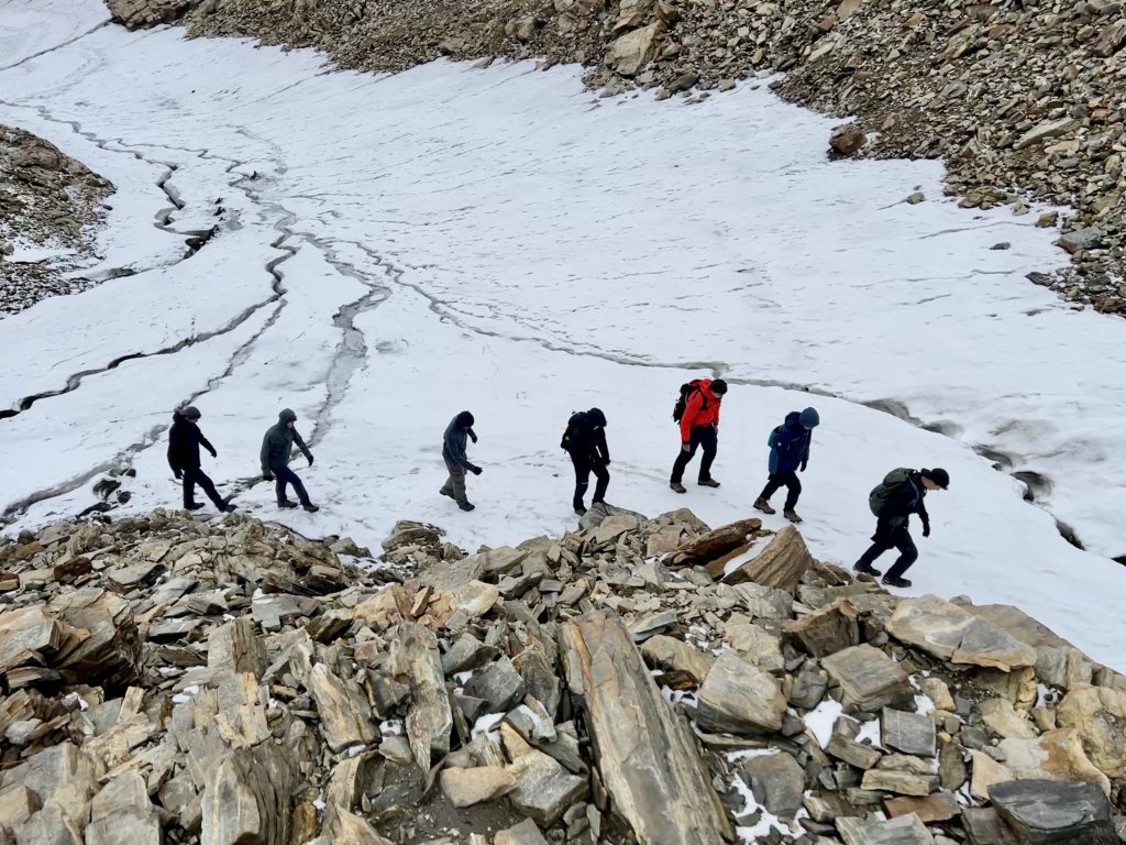 Auf den letzten 200 Metern unterhalb der Scharte ist in den letzten Jahren oft noch Restschnee zu finden gewesen, welcher im Zuge des Klimawandels allerdings inzwischen einem Geröllfeld gewichen ist. Für uns nicht unbedingt leichter, insbesondere, wenn jeder zweite Stein unter dem Fuß wegrutscht. Allerdings ist auch dieser Aufstieg irgendwann geschafft, was allerdings noch höhere Windgeschwindigkeiten innerhalb der Scharte bedeutet. Laut Mitwandernden ca. 130 km/h, der Venturi-Effekt lässt grüßen und die sonst oft so theoretische Physik in den Räumen 3.09, 3.11 und 3.13 wird auf einmal ganz schön spürbar.