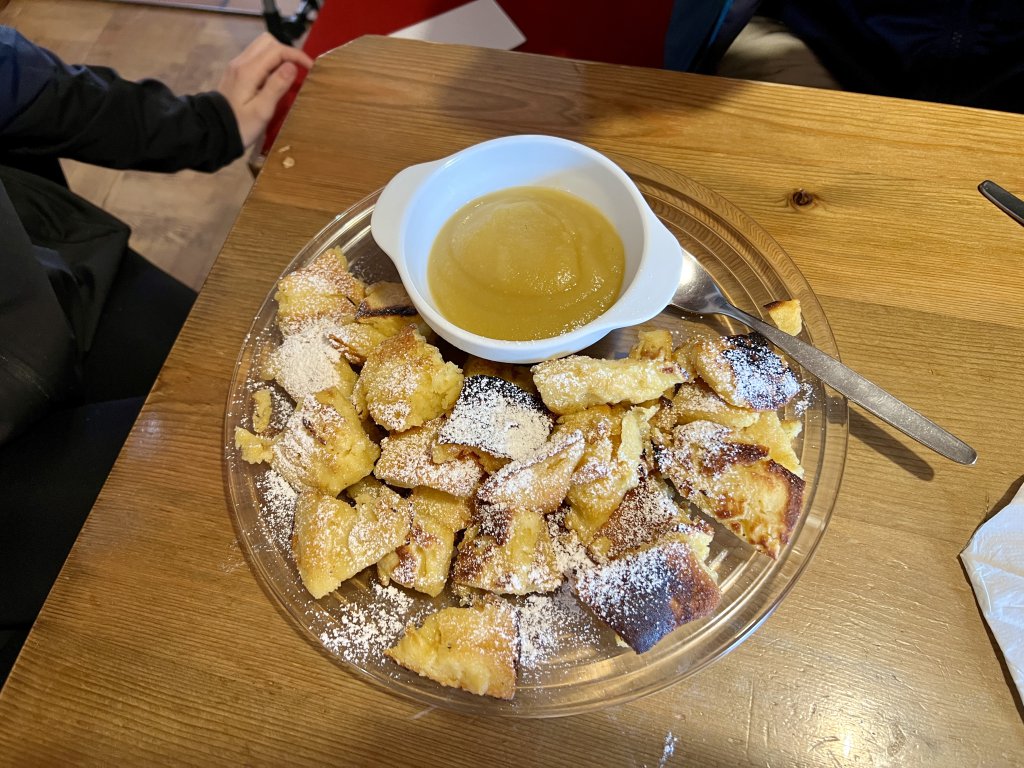 Kurze Zeit später erreichten wir die Winklerner Alm. Dort wurden wir von dem jungen Kellner Nils strahlend mit den Worten begrüßt: „Seid ihr die Wuppertaler? Ich hab schon viel von euch gehört!“ Es stellte sich heraus, dass die Düsseldorfer Gruppe, die zwei Tage vor uns hier gewesen war, bereits ausgiebig von unseren gemeinsamen Erlebnissen erzählt hatte. Wir ließen uns bei herrlichem Panorama und Sonnenschein das Mittagessen schmecken – Schlipfkrapfen und Kaiserschmarrn – und warteten auf den Rest der Gruppe.