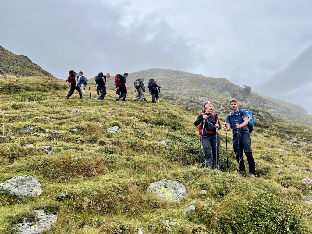 Um 8:20 Uhr ging es los Richtung Elberfelder Hütte, unserer Sektionshütte. Vor uns lag ein anfangs entspannter und dann recht steiler Weg. Der entspannte Weg, der Eselsteig, ging über eine lange Gerade mit guter Aussicht, weichen gelb-grünen Wiesen und Sonne, begleitet von Gesang und guter Stimmung. Nach ca. 90 min machten wir die erste große Pause, bei der wir schon den Gipfel des Bösen Weibeles (Höhe: 3100m) sichteten. Im Vergleich zu dem vorherigen entspannten Weg war die Pause kalt und eher unangenehm, da ein kalter Wind wehte. Der Boden war von dem regnerischen Wetter in der vorherigen Nacht noch nass und man konnte sich nicht entspannt hinsetzten. Nachdem Powerriegel und Brote trotzdem genossen wurden, ging es los in den schwierigsten Teil der Tour. Dieser Teil wurde von großen, nassen und rutschigen Steinen geprägt. Um diesen zu schaffen mussten wir unsere Schritte aufmerksam und gut wählen, weil sonst Steine oder wir fallen könnten. Das will ja keiner.