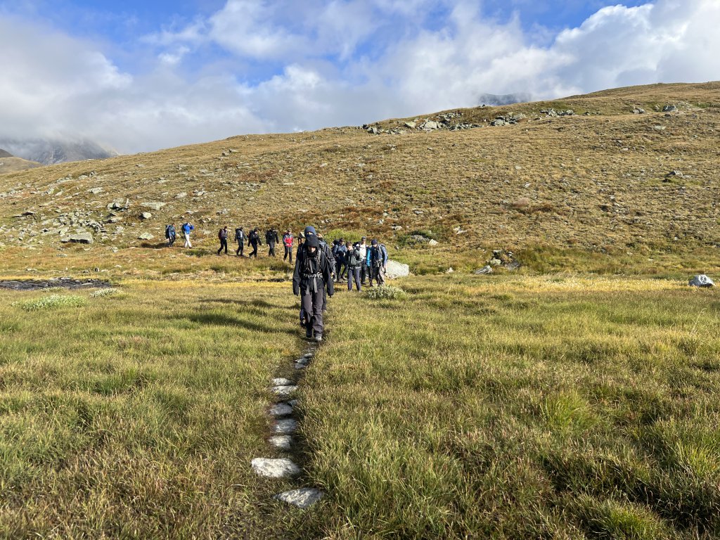 Wir hatten alles dabei: bergab, über Wiesenpfade, Steinfelder, steile und schmale Passagen, an denen man sich sogar an einem Seil festhalten musste und mit über 800 Höhenmetern im Aufstieg ingesamt. Der ein oder andere kleinere Schreckmoment durfte bei dieser anspruchsvollen Tour natürlich nicht fehlen und so ist Marko in ein Loch zwischen zwei Steinen getreten, so dass kurz der Fuß feststeckte. Außer Kratzer ist aber zum Glück nichts passiert und Marko konnte die Tour ganz normal fortsetzen. In solchen Momenten wird deutlich, wie wichtig Zusammenhalt, gegenseitige Unterstützung und Zuspruch innerhalb der Gruppe sind.