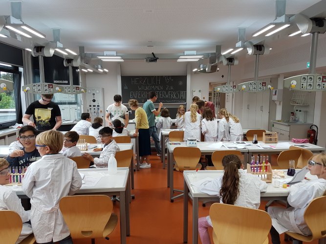 An insgesamt acht Nachmittagen erhielten Grundschülergruppen von acht bis zu vierundzwanzig Kindern aus verschiedenen Grundschulen Wuppertals und Umgebung in unseren Chemieräumen die Möglichkeit, chemische Versuche betreut durch ältere Schüler durchzuführen. Diese erklärten Phänomene wie die Wirkung von Indikatoren und vieles mehr. Alle Versuche wurden mit haushaltsüblichen Mitteln durchgeführt, sodass die Kinder die Möglichkeit haben sie auch zuhause nachzumachen.
