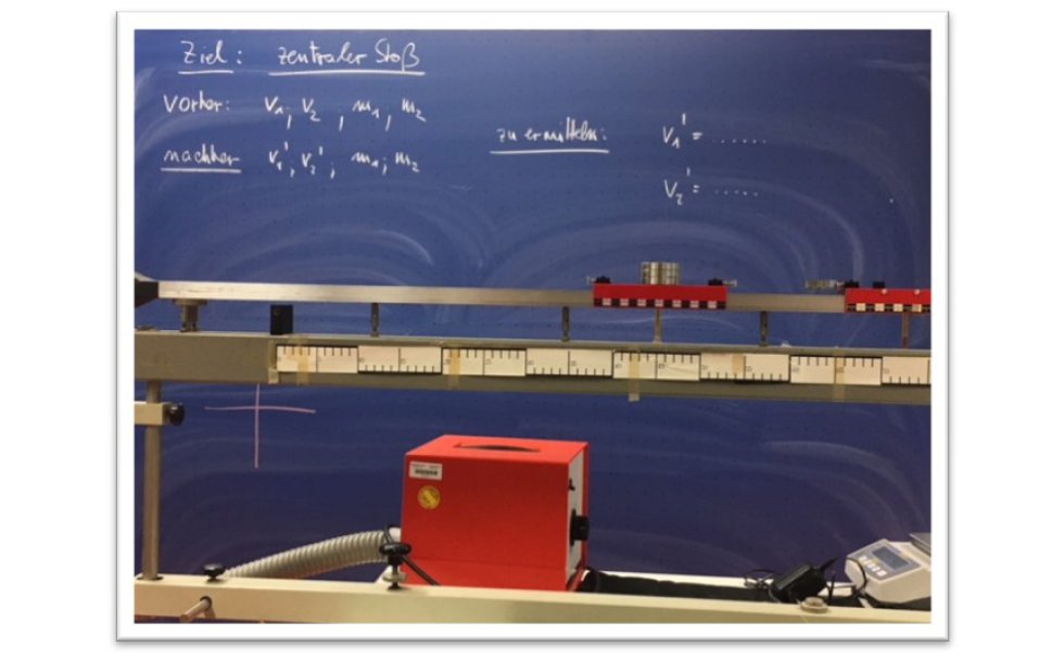 Die beiden Bilder zeigen Ihnen einen „klassischen“ Einsatz der iPads. Auftrag an die Schüler war es, die Formeln für den zentralen Stoß zweier Körper - z.B. Schlitten auf der Luftkissenfahrbahn - im Internet oder im Buch herauszufinden und danach diese Formeln mit Unterstützung selbst gefundener Artikel im Internet aus dem Energie- und Impulserhaltungssatz herzuleiten bzw. sich die Herleitung klarzumachen. Der Einsatz erfolgte ( heute ) in einem Physikkurs der Stufe EF (10).