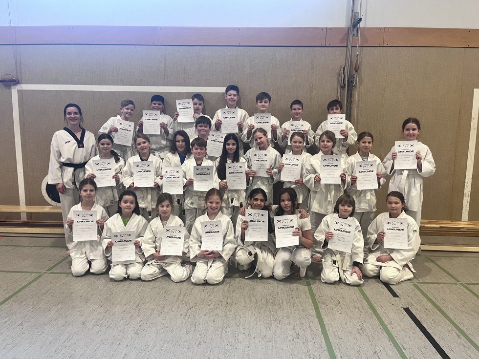 26 Schülerinnen und Schüler der 5. und 6. Klassen haben erfolgreich an der Taekwondo-Prüfung im Rahmen der Taekwondo-AG teilgenommen. In den vergangenen Wochen lernten sie mit viel Engagement grundlegende Techniken, Disziplin sowie wichtige Werte wie Respekt und Durchhaltevermögen. Als Anerkennung für ihre Leistungen erhielten alle Teilnehmenden eine Urkunde und dürfen ab sofort den weiß-gelben Gürtel zur Sportkleidung tragen. Wir gratulieren herzlich zu diesem Erfolg und freuen uns über die tollen Fortschritte, die in der AG erzielt wurden!