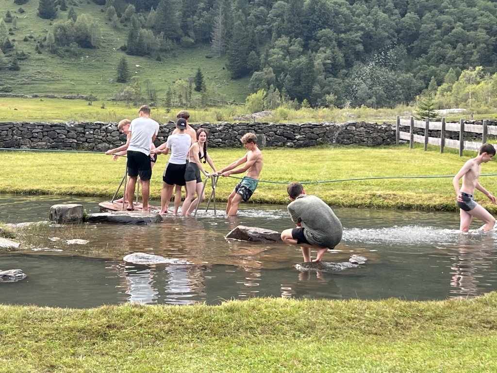Eine Gruppe ging mit Mark direkt weiter, ich machte mit ein paar Jungs noch Mittagspause. natürlich auch bei der Hängebrücke. Auf den letzten Metern hatten auch wir eine Kuhbegegnung. Die Kühe standen einfach alle direkt vor dem Gatter. Da half nur warten. Die Jungs schickten mich vor, als die Herde sich in Begegnung setzte und ich wählte den Weg obenrum, den es offiziell natürlich so nicht gab. Kühe sind ganz schön groß. Nach dem tierischen Zwischenfall sahen Anton, Nick, Paul H., Luca, Jannik und Jonathan nur noch das Ziel vor Augen, sodass ich zwischenzeitlich immer joggen musste, um den Anschluss nicht zu verlieren. Puh! Siebzehn müsste man nochmal sein!