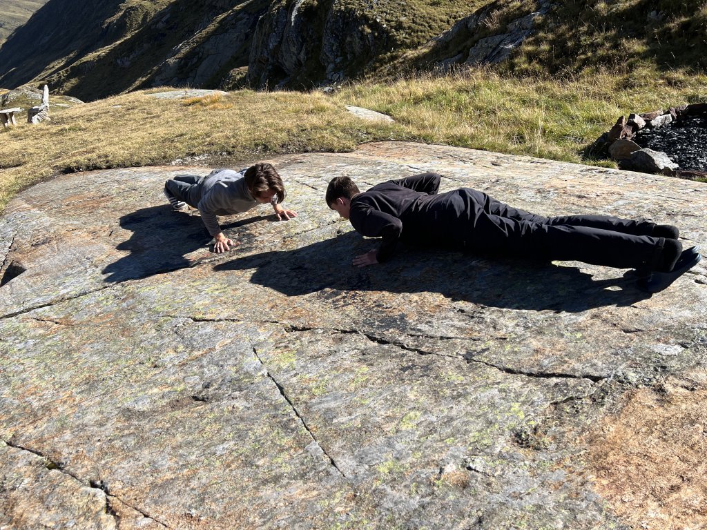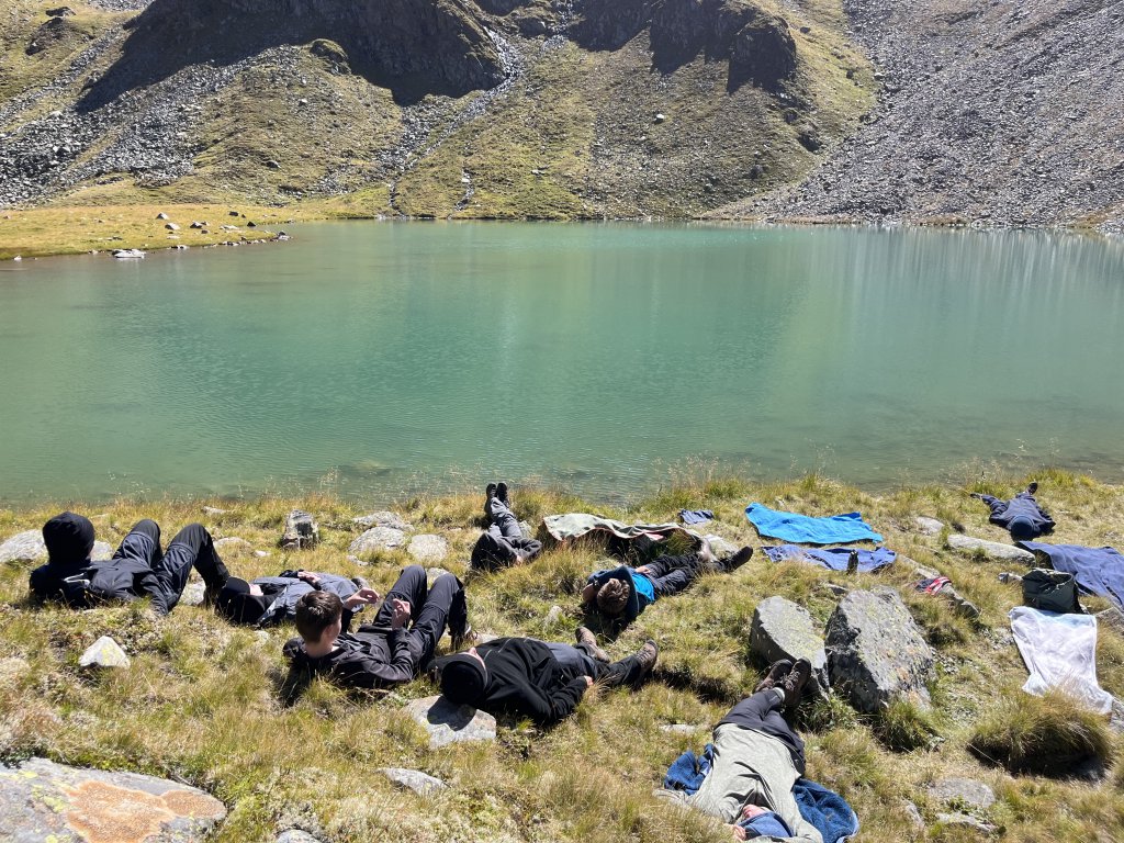 Einschub von Frau Franke: Wir, das sind Mark, die beiden Pauls und Antons, Joni, Janic, Nick, Franz und ich, wanderten zu den Langtalseen und schaffen damit Platz zur Reinigung der Hütte. Zunächst ging es 20 Minuten wieder bergauf, was zum Unmut einiger Schüler doch anstrengend war und mit der Aussage: „Warum wandern wir am Ruhetag?!“ begleitet wurde. Anschließend ging es weitere 20 Minuten zum See und als wir uns schon fragten, wann der See endlich kommt, erstreckte er sich plötzlich in tiefem Türkis vor uns, zwischen steilen Berghängen, unter fast wolkenlosem blauen Himmel. Die Jungs sprangen sofort ins kalte Wasser und zogen eine kleine Runde. Krebsrot, aufgrund der Kälte, krochen sie wieder aus dem Wasser und packten sich in dicke Jacken und Mützen ein. Danach wurde sich eine halbe Stunde in der Sonne aufgewärmt und anschließend der Rückweg angetreten. -