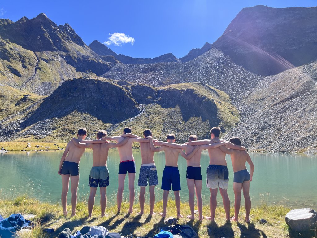 Frisch gestärkt machten wir uns an die letzten Höhenmeter zur Glorerhütte. Auf dem Weg eröffnete mir Paul, dass die Teilnahme an der Überquerung jetzt schon die beste Entscheidung seiner Schulzeit war. Das ist schon schön zu hören. Einige Jungs wagten sogar noch ein Bad im kleinen Bergsee, um sich anschließend mit eiskaltem Quellwasser zu duschen. Ich persönlich entschied: Heute reicht eine Katzenwäsche. Sicherheitshalber habe ich schon bei Lucas nachgefragt und auf der Elberfelder wird dann warm geduscht.
