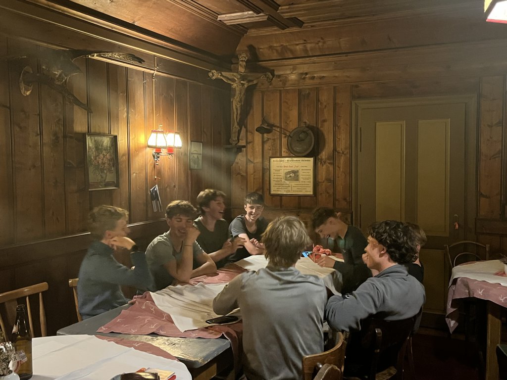 Rauf kommt man ja immer, aber der Abstieg war die eigentliche Herausforderung. Paul richtete nochmal seine Kniebandagen und der Rest schnürte die Bergschuhe fest und die eigentliche Herausforderung konnte angegangen werden. Marc ging voraus und ich diesmal hinten. Dort wurde ich von Paul, Jasper und Ilja gut unterhalten. Ob es für die Schüler* innen oder für mich das größere Wagnis war, kann ich nicht beurteilen, aber wir haben es aufgesucht, ausgehalten und aufgelöst. Beim Blick zurück konnten es Ilja und Paul kaum glauben, wo sie da heute runter sind. Den gesamten Abstieg hatten wir schon das Ziel im Blick. Angekommen bestellten die Schüler*innen erstmal alles, was die Speisekarte hergab. Abends wurde Jenga, Uno und Kniffel gespielt oder der Sonnenuntergang mit Zeitraffer gefilmt.