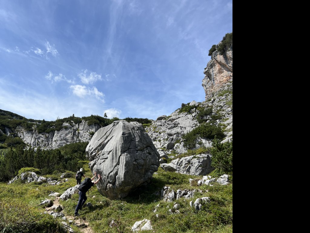 Wir hatten alles dabei: bergab, über Wiesenpfade, Steinfelder, steile und schmale Passagen, an denen man sich sogar an einem Seil festhalten musste und mit über 800 Höhenmetern im Aufstieg ingesamt. Der ein oder andere kleinere Schreckmoment durfte bei dieser anspruchsvollen Tour natürlich nicht fehlen und so ist Marko in ein Loch zwischen zwei Steinen getreten, so dass kurz der Fuß feststeckte. Außer Kratzer ist aber zum Glück nichts passiert und Marko konnte die Tour ganz normal fortsetzen. In solchen Momenten wird deutlich, wie wichtig Zusammenhalt, gegenseitige Unterstützung und Zuspruch innerhalb der Gruppe sind.