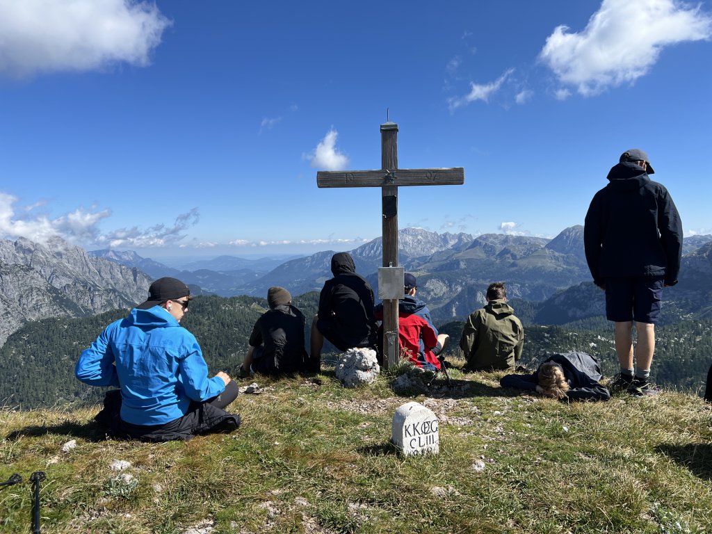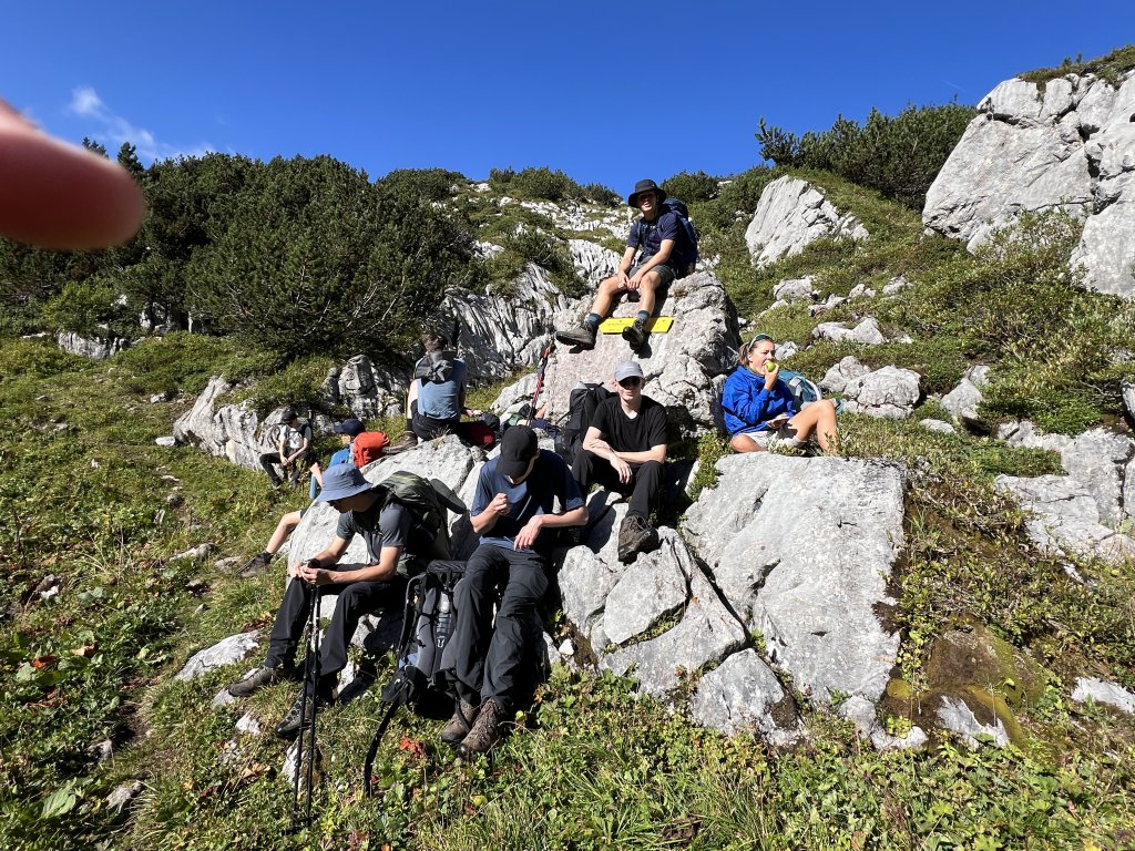 Während des Aufstiegs zur Scharte wurde, wie schon an den Vortagen, reichlich gesungen, um die Moral hoch zu halten. Jasper und Ilja sind da immer ganz in ihrem Element. Oben an der Scharte angekommen, nach ca. 450 Höhenmetern, legten wir eine Pause ein und genossen die wunderschöne Aussicht. Wir konnten bis zu den Dolomiten sehen.