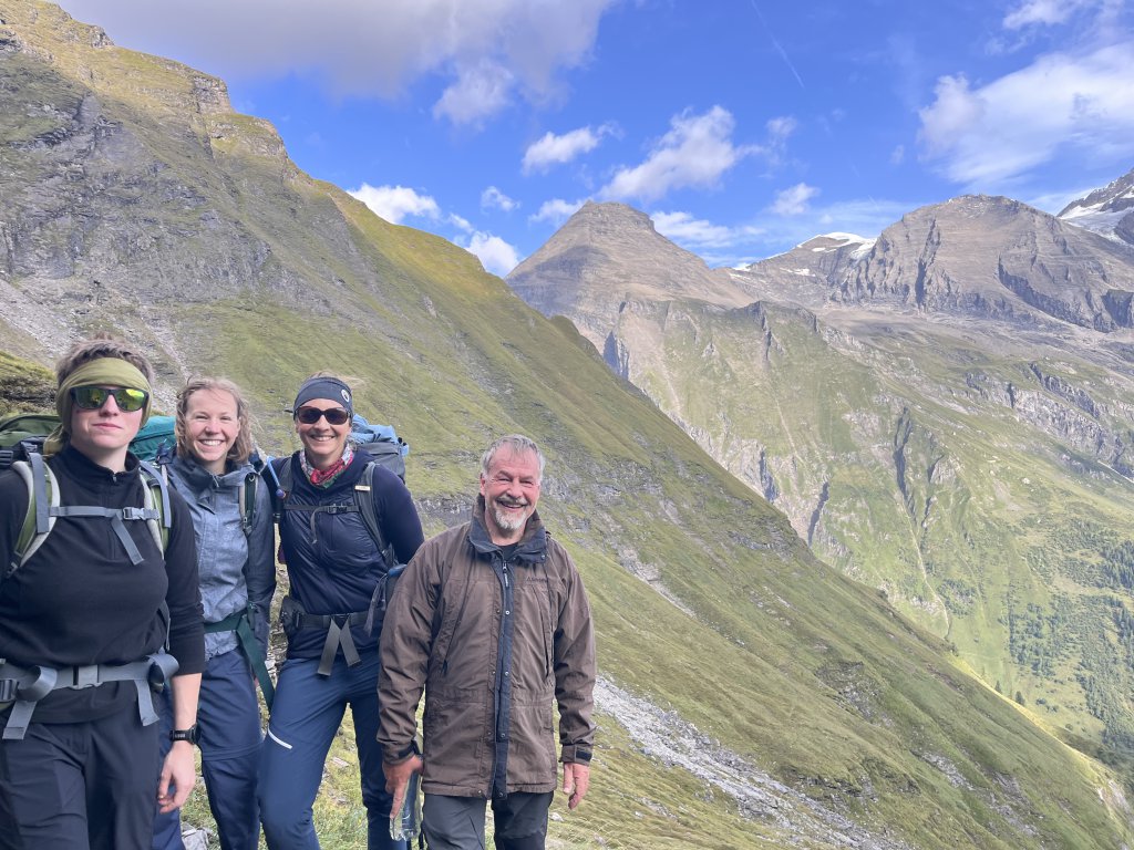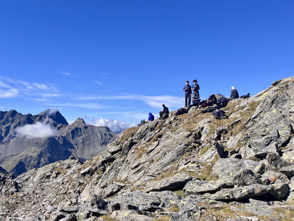 Die Petzeck-Gruppe stand nach ca. drei Stunden erfolgreich auf dem höchsten Berg der Schobergruppe (3.283 m). Oben lag sogar noch etwas Schnee, und zeitweise hatten wir freie Sicht auf den Großglockner, das Kitzsteinhorn und die Venedigergruppe. Paul S. musste feststellen, dass es viel entspannter ist, wenn man hinter dem „Bergführer“ geht – in diesem Fall war das Jonatan M., der uns in meditativer Ruhe und einem sehr gutem Gespür für den Weg zum Gipfel führte. Insgesamt waren wir fast acht Stunden unterwegs: 900 Höhenmeter rauf und 1.470 Höhenmeter runter.