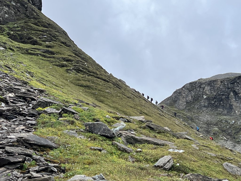 Auf den letzten 200 Metern unterhalb der Scharte ist in den letzten Jahren oft noch Restschnee zu finden gewesen, welcher im Zuge des Klimawandels allerdings inzwischen einem Geröllfeld gewichen ist. Für uns nicht unbedingt leichter, insbesondere, wenn jeder zweite Stein unter dem Fuß wegrutscht. Allerdings ist auch dieser Aufstieg irgendwann geschafft, was allerdings noch höhere Windgeschwindigkeiten innerhalb der Scharte bedeutet. Laut Mitwandernden ca. 130 km/h, der Venturi-Effekt lässt grüßen und die sonst oft so theoretische Physik in den Räumen 3.09, 3.11 und 3.13 wird auf einmal ganz schön spürbar.
