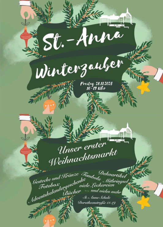 Wie sich ja bereits herumgesprochen hat, wird es in diesem Jahr, am Freitag, dem 28.11.2025, und zwar von 16 Uhr bis 19 Uhr, unseren ersten "Winterzauber"-Weihnachtsmarkt an St. Anna geben! Der "Winterzauber" nun ist ein Weihnachtsmarkt von uns allen an St. Anna und für alle Schülerinnen und Schüler, Lehrer, Eltern, Familien, Ehemalige und Freunde.